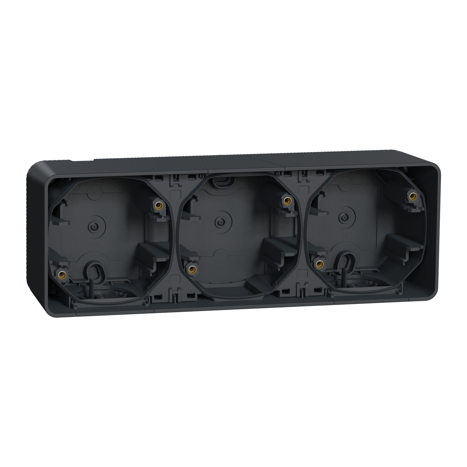 The Mureva Styl surface mounted box is a robust and waterproof IP55 device when associated with a Mureva Styl box cover. Easy handling with its large cabling space. It has enough position to welcomes three inserts. This product can be used indoor as well as outdoor in the horizontal way. its dimensions are : 54 mm height, 76 mm width, 54 mm and 218 mm length..