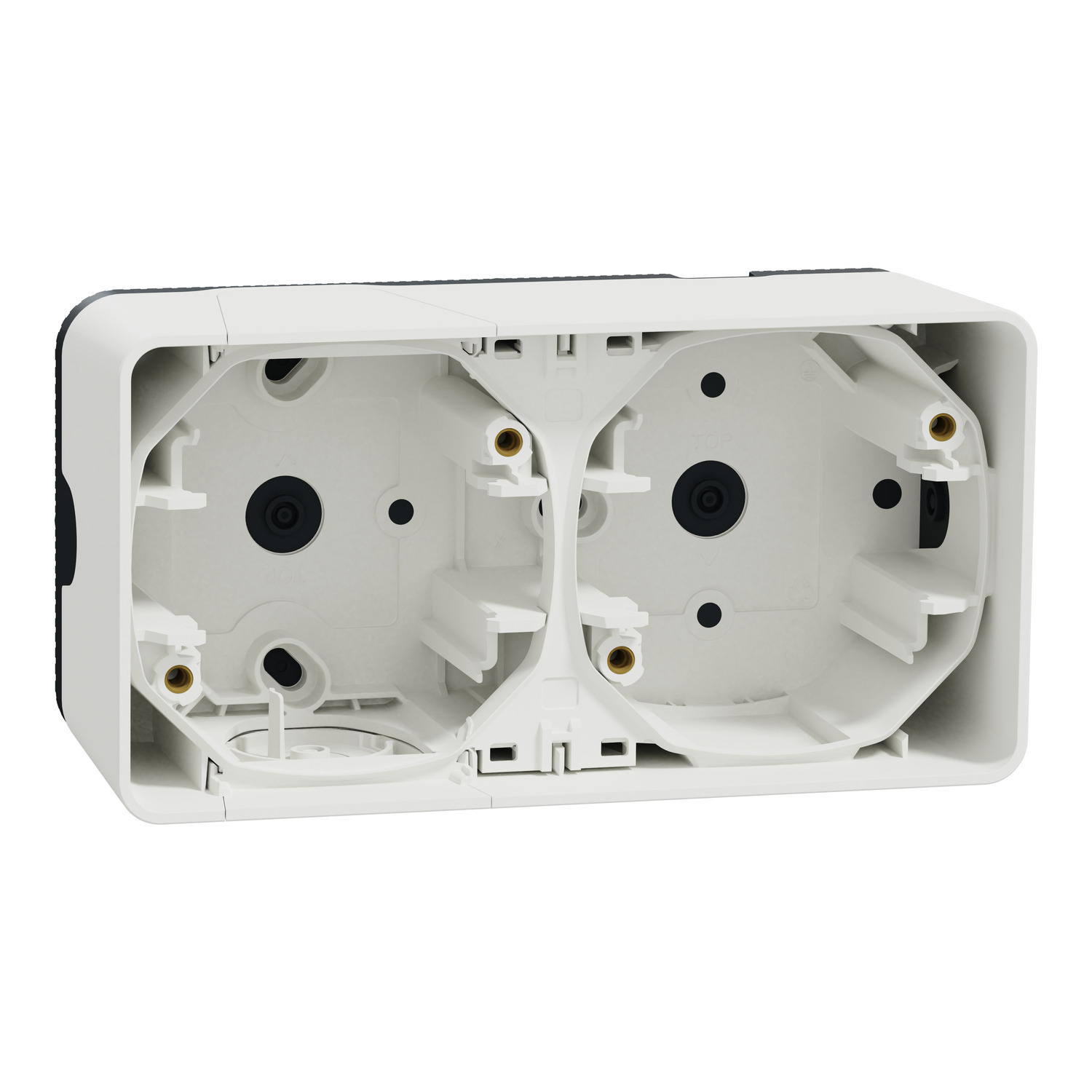 The Mureva Styl surface mounted box is a robust and waterproof IP55 device when associated with a Mureva Styl box cover. Easy handling with its large cabling space. It has enough position to welcomes two inserts. This product can be used indoor as well as outdoor in the horizontal way. its dimensions are : 54 mm height, 76 mm width, 54 mm and 147 mm length..