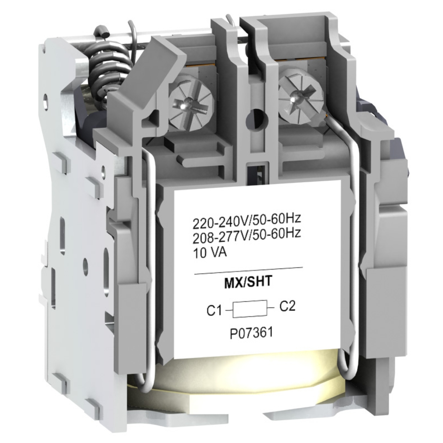 This is a MX shunt trip release for Compact NSX, PowerPact Multistandard and EasyPact CVS circuit breakers. Its rated voltage is 30 VDC. It is an auxiliary used for emergency off or remote opening applications. This auxiliary opens the circuit breaker when the control voltage Un rises above 70% of its rated voltage Un. It complies with IEC 60947-2 standard. This shunt trip is a UL Listed/CSA Certified circuit breaker accessory. Compact NSX, PowerPact Multistandard and EasyPact CVS can be equipped with either 1 MX or 1 MN auxiliary..