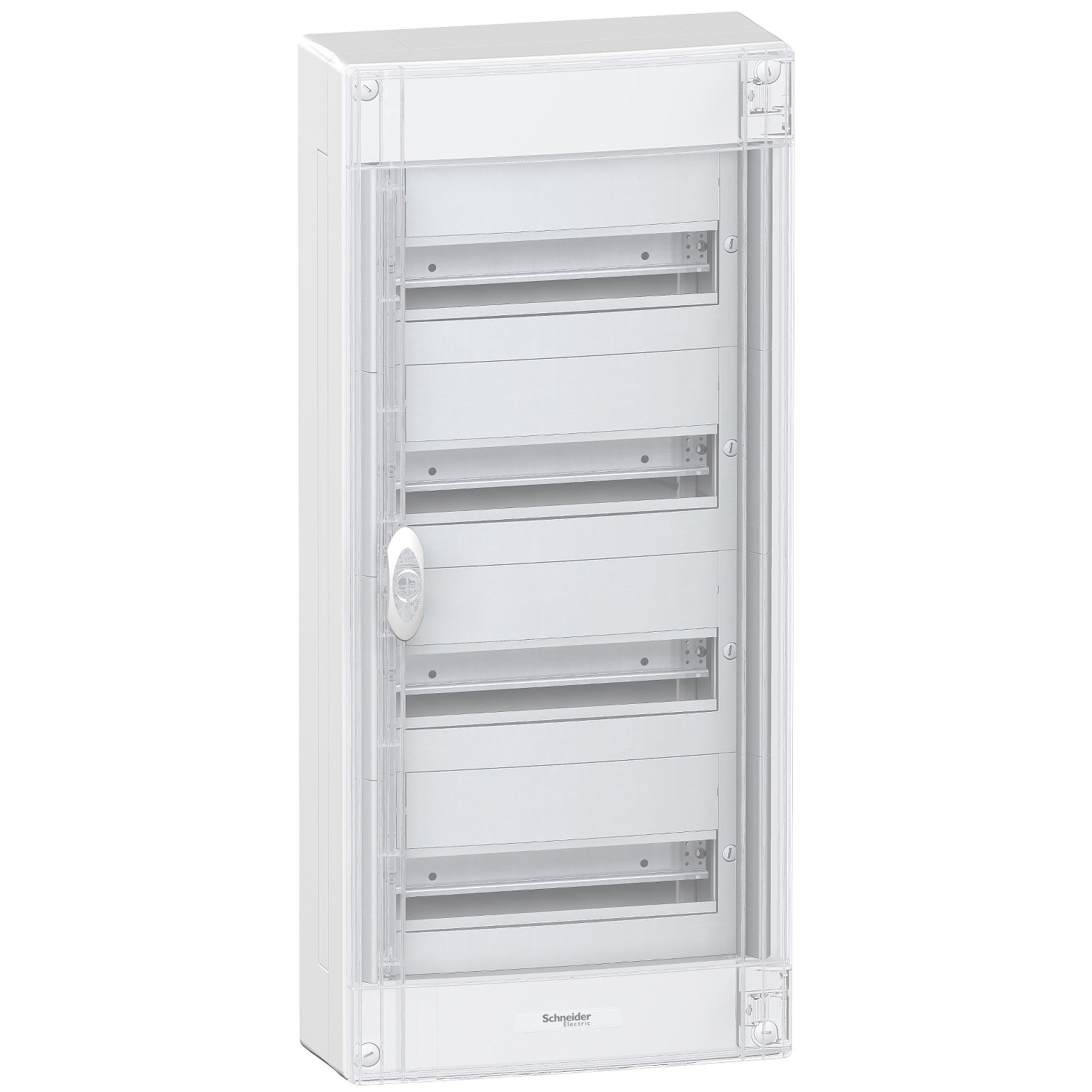This Pragma enclosure is a surface mounted distribution enclosure. This plastic enclosure is composed of 4 rows of 13 modules of 18mm. It can accomodate all types of modular switchgear. This enclosure is dedicated to indoor installation. The IP degree of protection is IP40 closed door and IP30 open door. It is provided with a transparent colourness door. The colour of the enclosure is white (RAL 9016). The one of the front face is grey (RAL 7004). It is intended for new or renovated installation in residential and small buildings. The cables can enter via the 4 sides of the enclosure by removable cable plate or via the back of the enclosure. It enables entry by cable, tube or trunking. It is equipped with a back plate and a reversible front cover with notch. It is provided with DIN rail fixed on the back of the enclosure. It comes with 1 earth and 1 neutral terminal block with its support. The earth terminal block has 29 outgoers (4x25mm² + 25x4mm²). The neutral one has 29 outgoers (4x25mm² + 25x4mm²). Marking label, label protector and blanking plate are also delivered within the product. The electrical insulation class is class II (double insulated). The overvoltage category is class II. The In rated current is up to 90A. The dissipated power is 53W. This product complies with IEC 61439-1 and 3, IEC 60670-1 and 24 standard. The dimensions are (W) 336mm x (H) 750mm x (D) 143mm. The material is a plastic self-extinguishing material. Its resistance to flames and to abnormal heat is 650°C as per IEC 60695-2-11. The IK degree of protection is IK08 open door and IK09 closed door. The operating temperature is -25°C to 60°C..