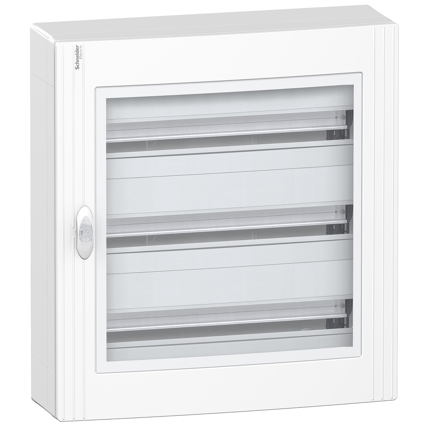 This Pragma enclosure is a surface mounted distribution enclosure. This metal and plastic enclosure is composed of 3 rows of 24 modules of 18mm. It can accomodate all types of modular switchgear. This enclosure is dedicated to indoor installation. The IP degree of protection is IP40 closed door and IP30 open door. It is provided with a transparent colourness door. The colour of the enclosure is white (RAL 9016). The one of the front face is grey (RAL 7004). It is intended for new or renovated installation in residential and small buildings. The cables can enter via the 4 sides of the enclosure by removable cable plate or via the back of the enclosure. It enables entry by cable, tube or trunking. It is equipped with a back plate and a reversible front cover with notch. It is provided with DIN rail fixed on the back of the enclosure. It comes with 1 earth and 1 neutral terminal block with its support. The earth terminal block has 27 outgoers (2x25mm² + 24x6mm² + 1x50mm²). The neutral one has 29 outgoers (4x25mm² + 24x6mm² + 1x50mm²). Marking label, label protector and blanking plate are also delivered within the product. The electrical insulation class is class II (double insulated). The overvoltage category is class II. The In rated current is up to 160A. The dissipated power is 76W. This product complies with IEC 61439-1 and 3, IEC 60670-1 and 24 standard. The dimensions are (W) 550mm x (H) 600mm x (D) 173mm. The material is a metal and plastic self-extinguishing material. The material is a plastic self-extinguishing material for the door. The resistance of the plastic to flames and to abnormal heat is 650°C as per IEC 60695-2-11. It is halogen free. The IK degree of protection is IK08 open door and IK09 closed door. The operating temperature is -25°C to 60°C..