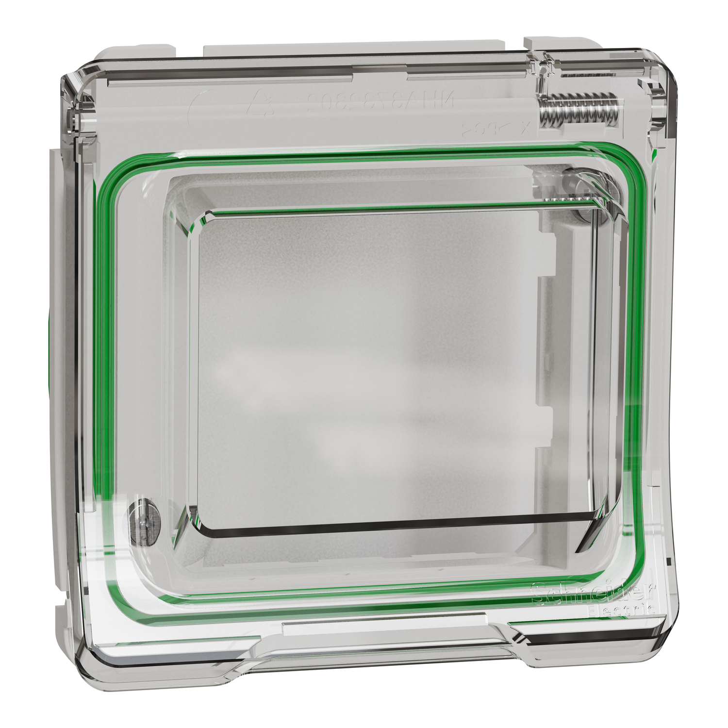 The Mureva Styl box cover with lid for Unica is a robust and waterproof IP55 device when associated with a Mureva Styl box. The transparent lid is also perfect to see the insert, behind it, even when its closed. This product can be used in flush or in surface, indoor as well as outdoor. its dimensions are : 29 mm height, 71 mm width and 71mm length..