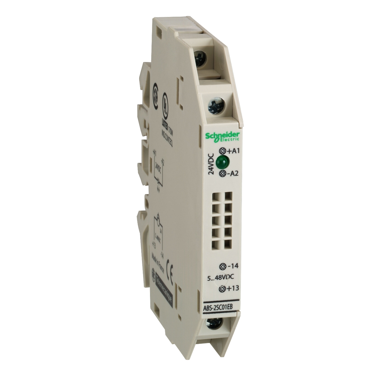This ABS2 output interface module is part of the range Zelio interfaces ABR/ABS. It is supplied in the form of slim module, 9.5 mm wide. It features a control circuit voltage of 24V DC. It is characterized by a high switching capacity and high durability. It is supplied with 1 NC contact and screw clamp terminals. Its protection index is IP20. It weighs 34g and its dimensions are, 9.5mm wide, 74mm high, 63mm deep. It is designed for interfacing discrete digital control signals exchanged within an automated system between the processing unit and the other components. It conforms to the most recent IEC 947-5-1 standards and is also UL and CSA certified. It can be mounted on symmetrical, combination or asymmetricall DIN rail..