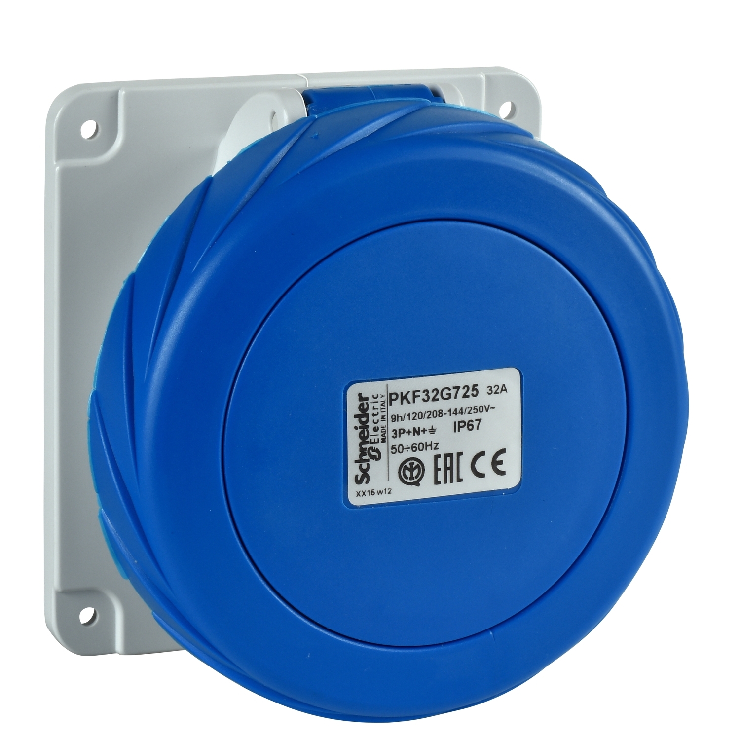 This Pratika industrial socket with captive screws connection is straight panel mounted. It has 3P+N+E poles, rated current is 16A and the operating voltage is 230VAC. The dimensions of the base plate are (W) 90mm x (H) 100mm. The degree of protection is IP67 and IK08. The fire resistance is 850°C. The cable entries are for flexible or rigid cables. The cross section of the cables in 16A is 1mm² to 4mm². The color of the socket is light grey (RAL 7035) with blue easy identification of the operating voltage. The frequency is 50Hz or 60Hz. The clock position of contact is 9h..