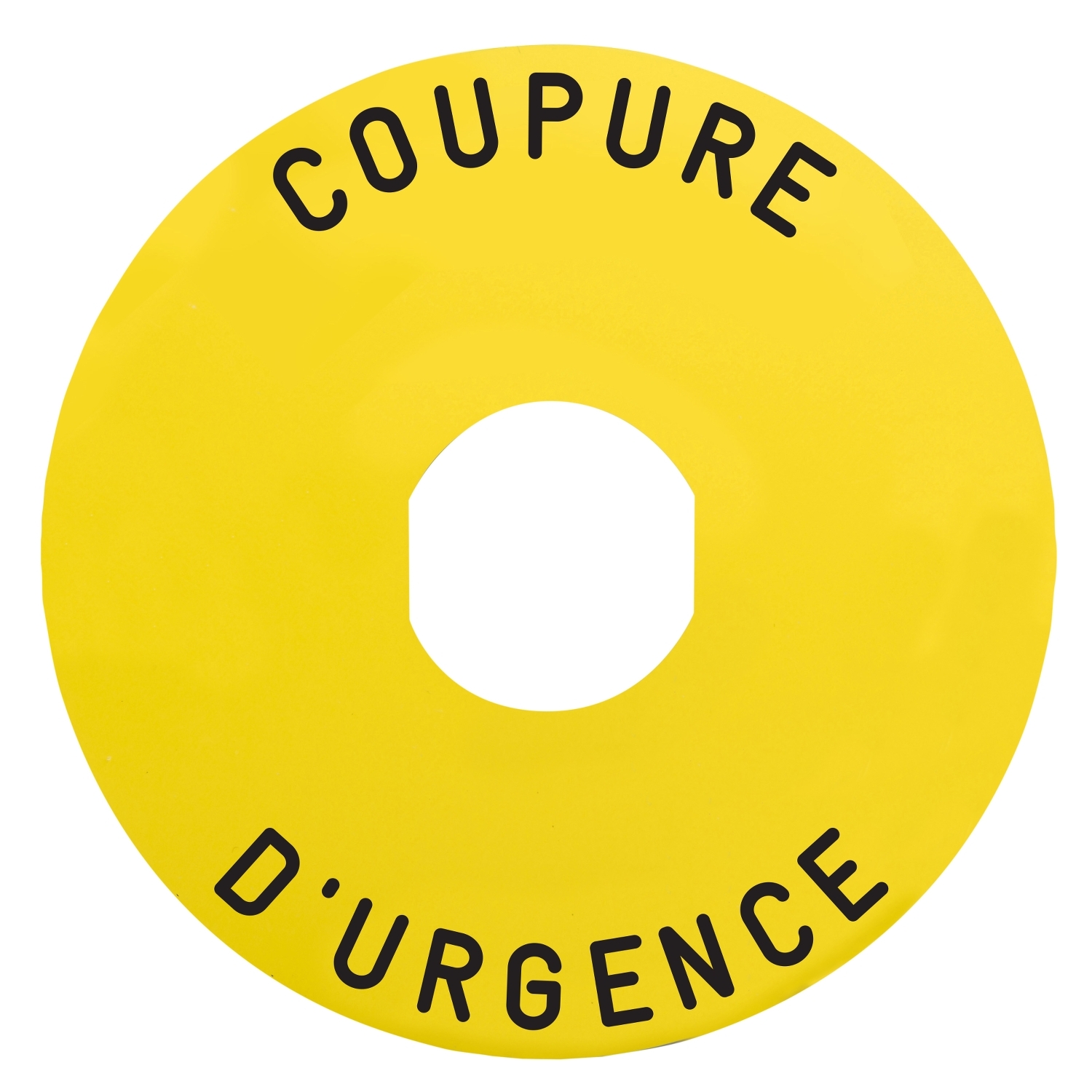 This Harmony ZBY circular legend for emergency switching off function has yellow background and is marked with "COUPURE D'URGENCE" lettering, and a diameter of 90mm. It is compatible with Harmony XB4, XB5 and XB7 push buttons and pilot lights. This circular legend provides clear labelling of your emergency switching off units. It is supplied ready engraved with a marking relevant to machine operation and is compatible with Harmony emergency stop or switching off unit. It provides clear and resilient symbol marking on the label, with high contrast..