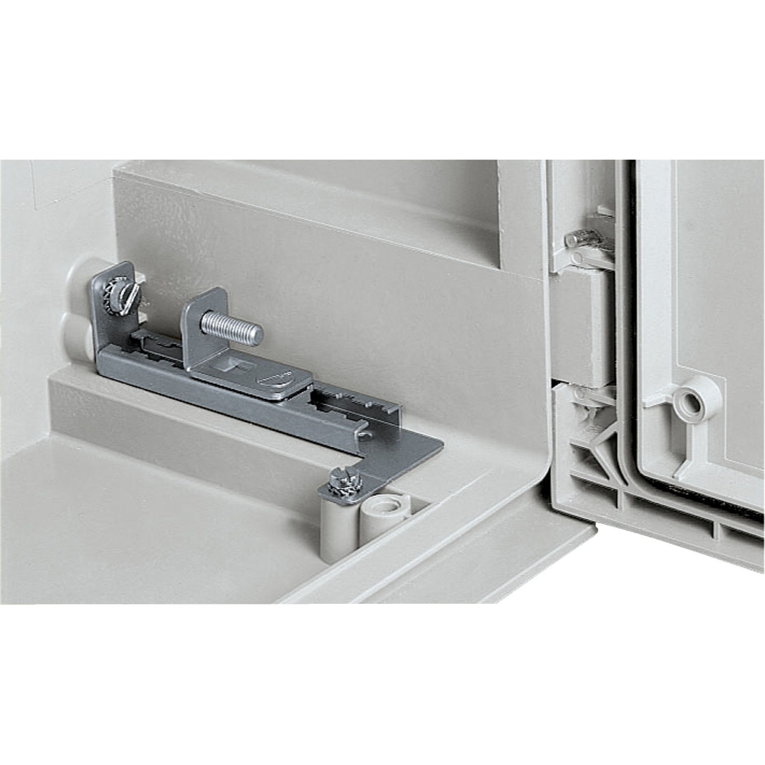 Set of 4 step slides with brackets for adjustment of mounting plate in PLM 43/54. Max depth adjustment is 156 mm, Min depth adjustment is 94 mm. Multi-purpose mounting accessory. Mounting on sides of enclosure. Adjustment is In depth of the plate or other accessories in steps of 12.5 mm. Galvanised Steel. 4 sliding rails and 4 sliding support incl..